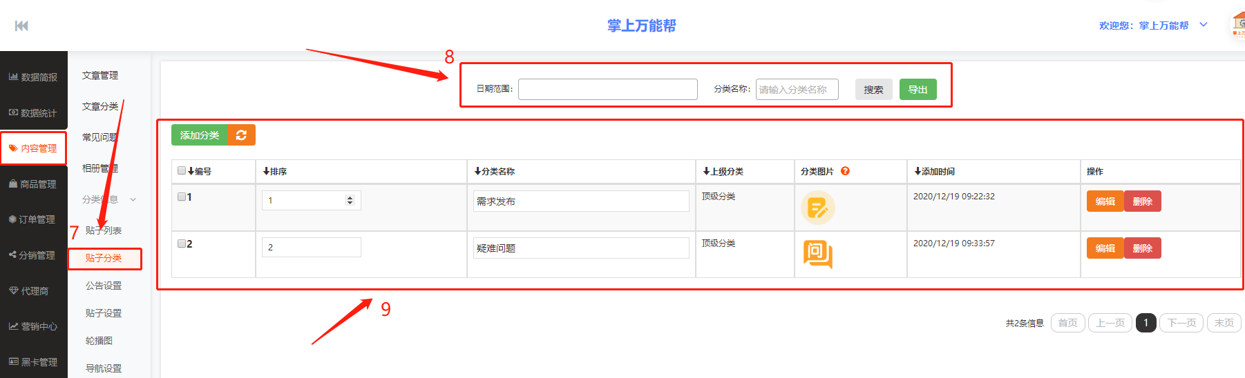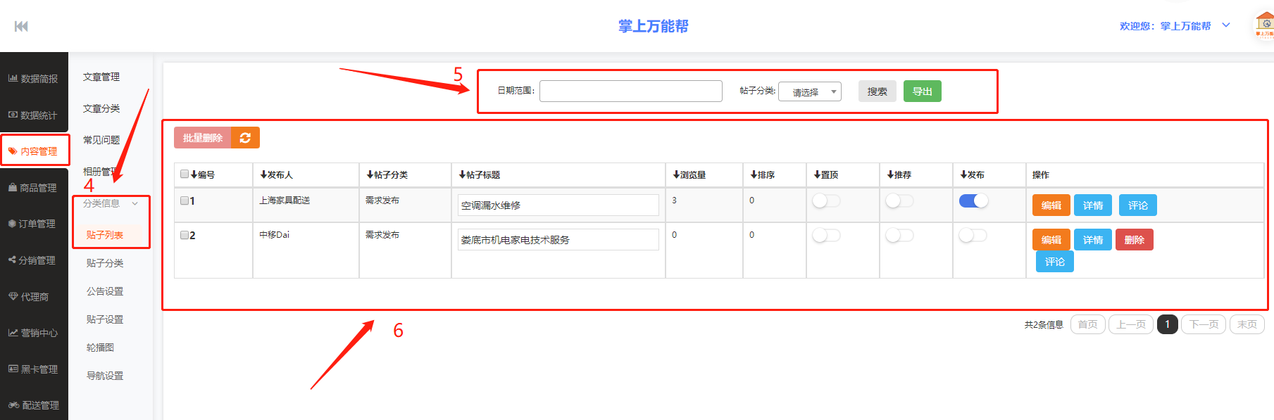 5、5框栏:5框栏中包括日期范围、帖子分类、搜索、导出项目栏。可在项目栏中进行编辑查看数据。