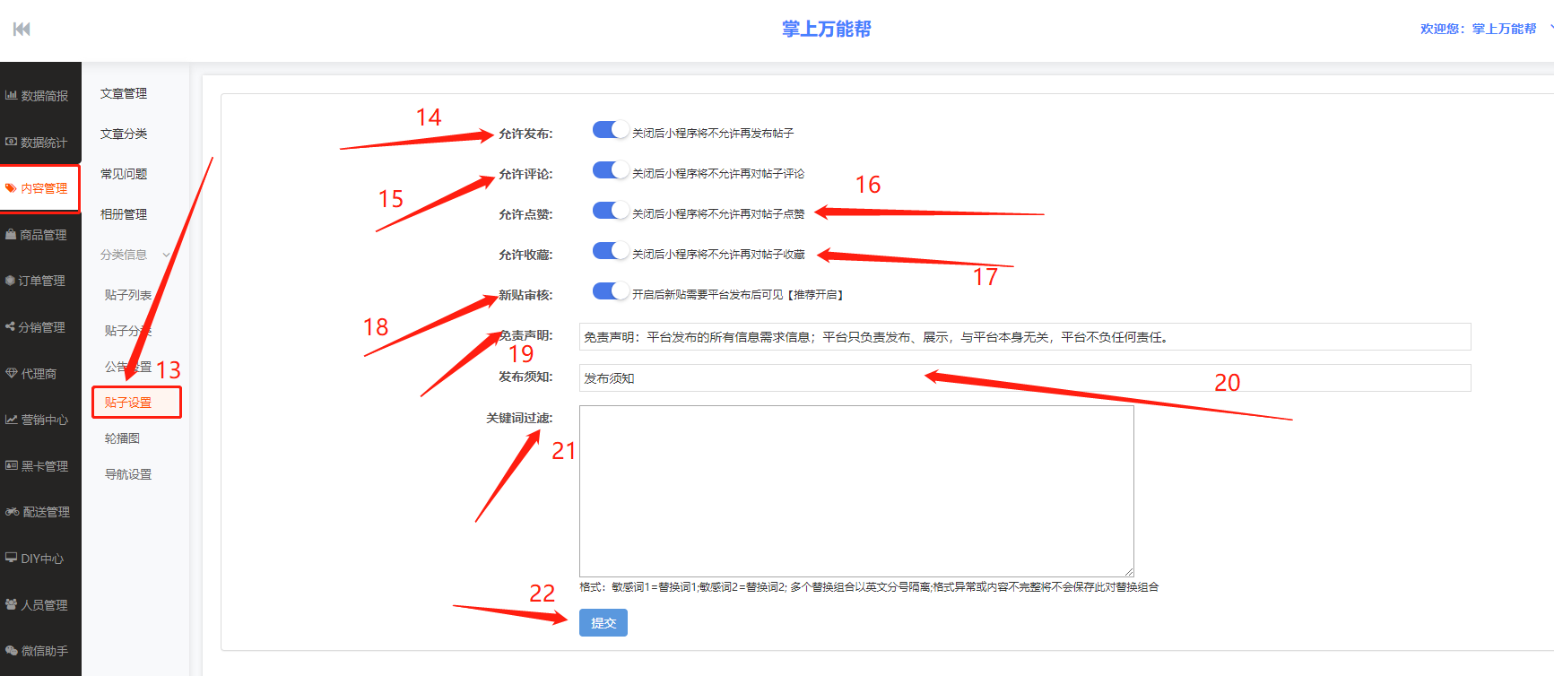 在平台上进入到内容管理中的分类信息------帖子设置。