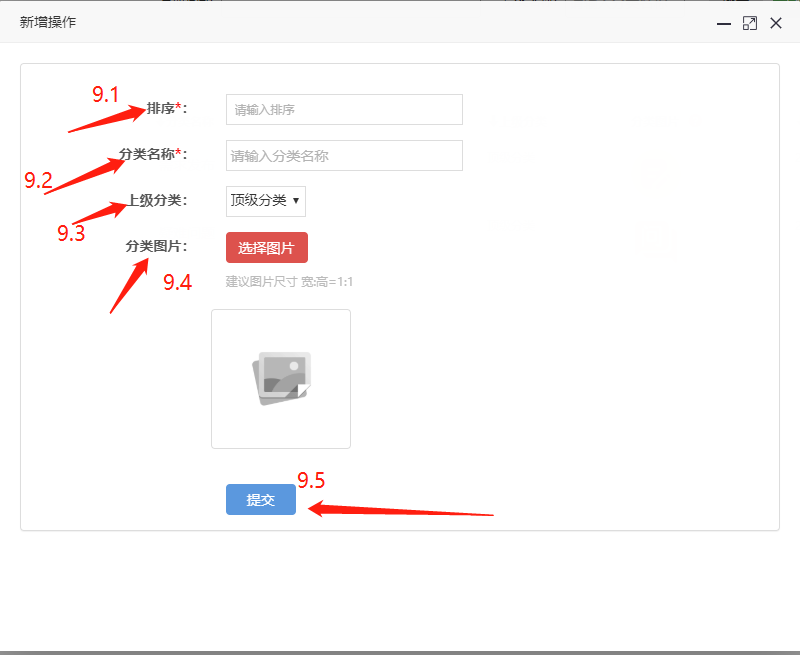 9、9框栏:9框栏中包括添加分类、编号、排序、分类名称、上级分类、分类图片、添加时间、操作、栏中结合表进行编辑查看数据。