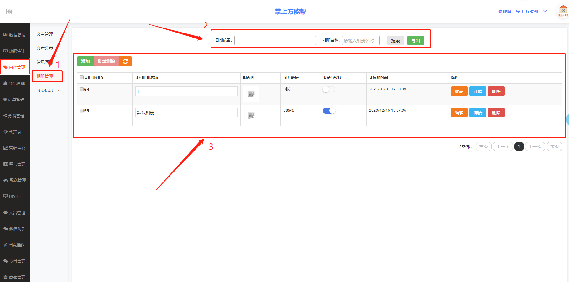 2、2框栏:2框栏中包括日期范围、相册名称、搜索、导出项目栏。可在项目栏中进行编辑查看数据。