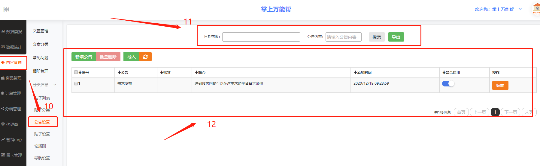 11、11框栏:11框栏中包括日期范围、公告内容、搜索、导出项目栏。可在项目栏中进行编辑查看数据。