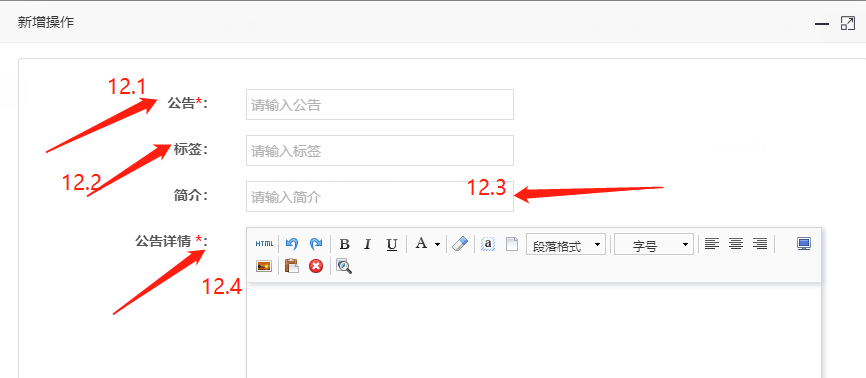 12、12框栏:12框栏中包括新增公告、批量删除、导入、编号、公告、简介、添加时间、是否启用、操作,栏中结合表进行编辑查看数据。