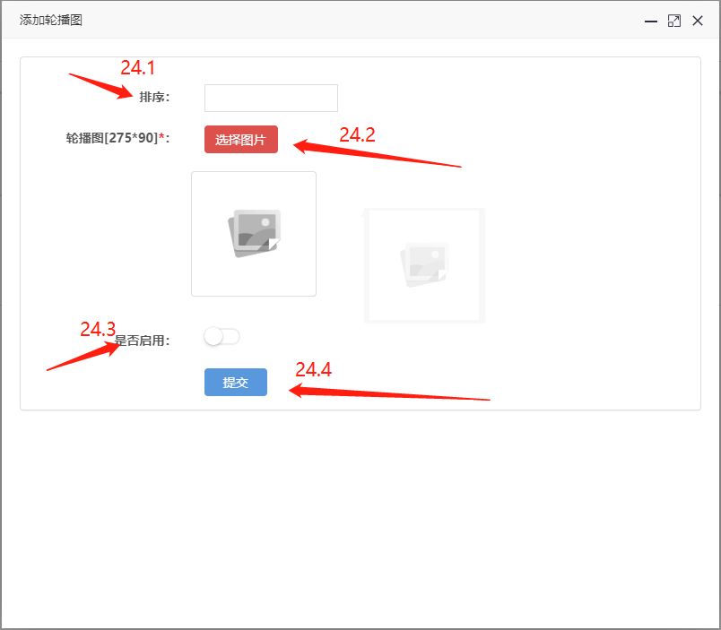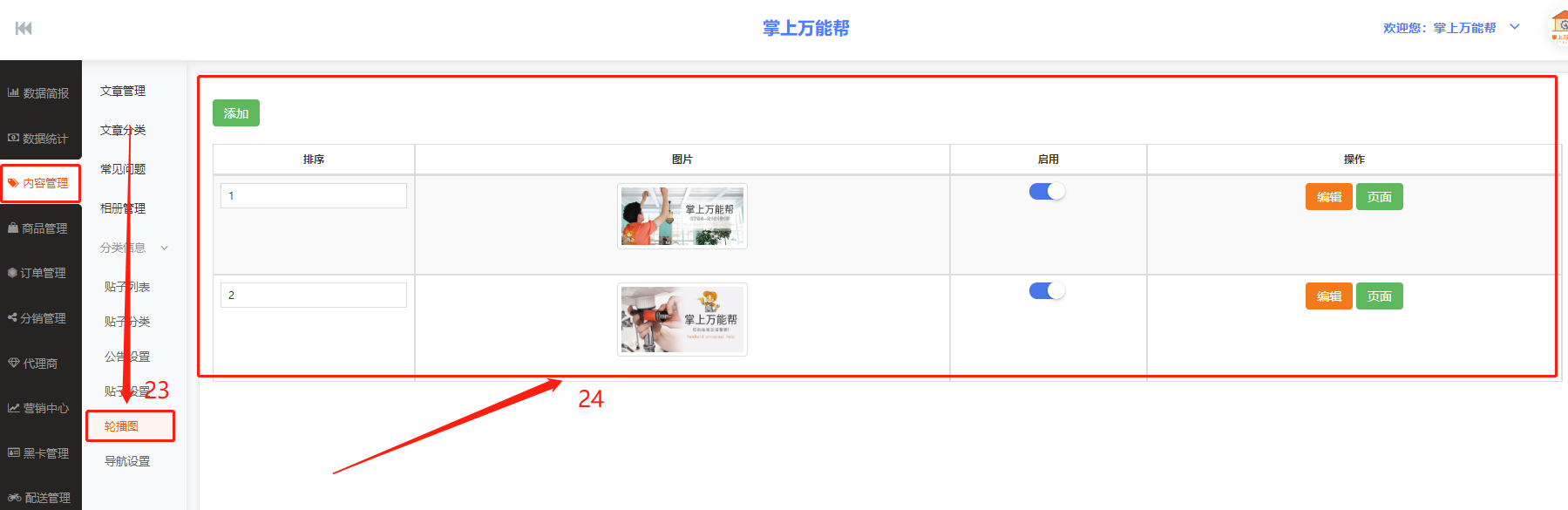24、24框栏:24框栏中包括添加、排序、图片、启用、操作、栏中结合表进行编辑查看数据。