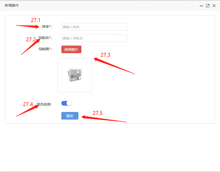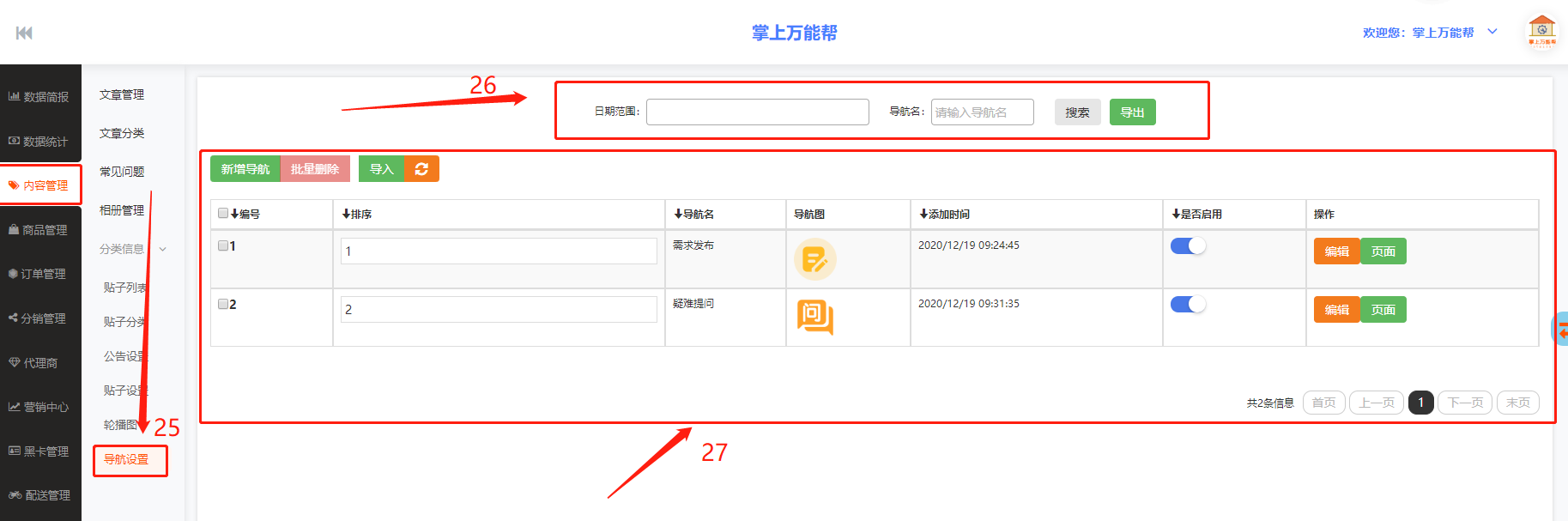 27、27框栏:27框栏中包括新增导航、批量删除、导入、编号、排序、导航名、导航图、是否启用、添加时间、操作,栏中结合表进行编辑查看数据。