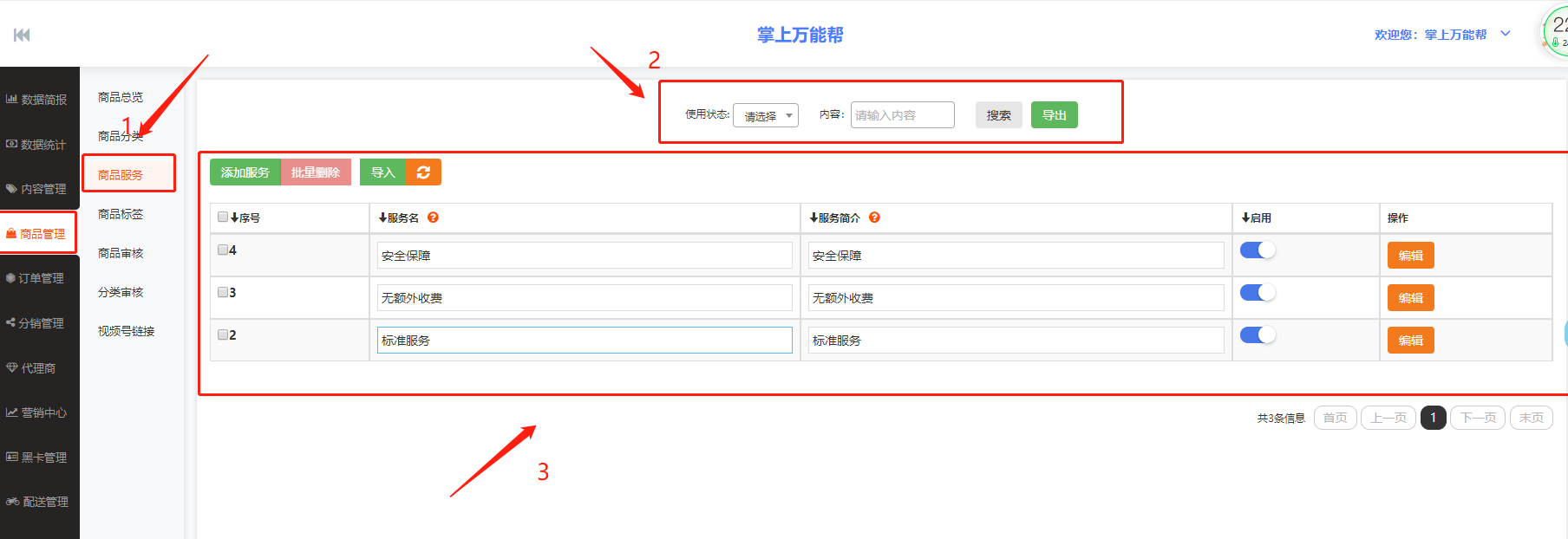 3、3框栏:3框栏中包括添加服务、批量删除、导入、序号、服务名、服务简介、启用、操作、栏中结合表进行编辑查看数据。