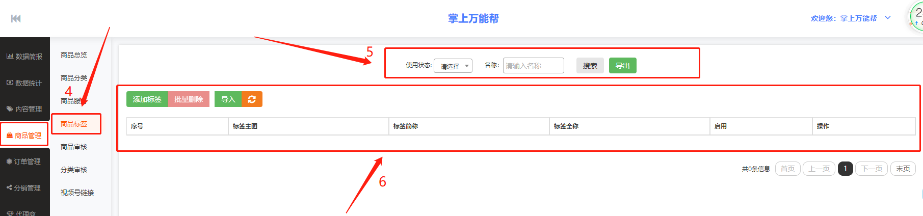 6、6框栏:6框栏中包括添加标签、批量删除、导入、序号、标签主图、标签简介、标签全称、启用、操作,栏中结合表进行编辑查看数据。