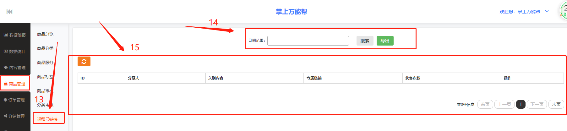 15、15框栏:15框栏中包括ID、分享人、关联内容、所属链接、获客次数、操作、可在项目栏中进行编辑查看数据。