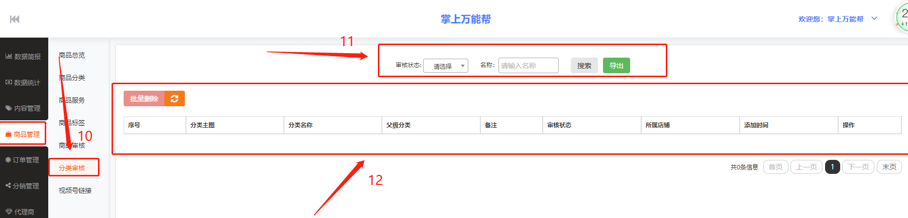 12、12框栏:12框栏中包括批量删除、序号、分类主图、分类名称、父级分类、备注、审核状态、所属店铺、添加时间、操作、可在项目栏中进行编辑查看数据。