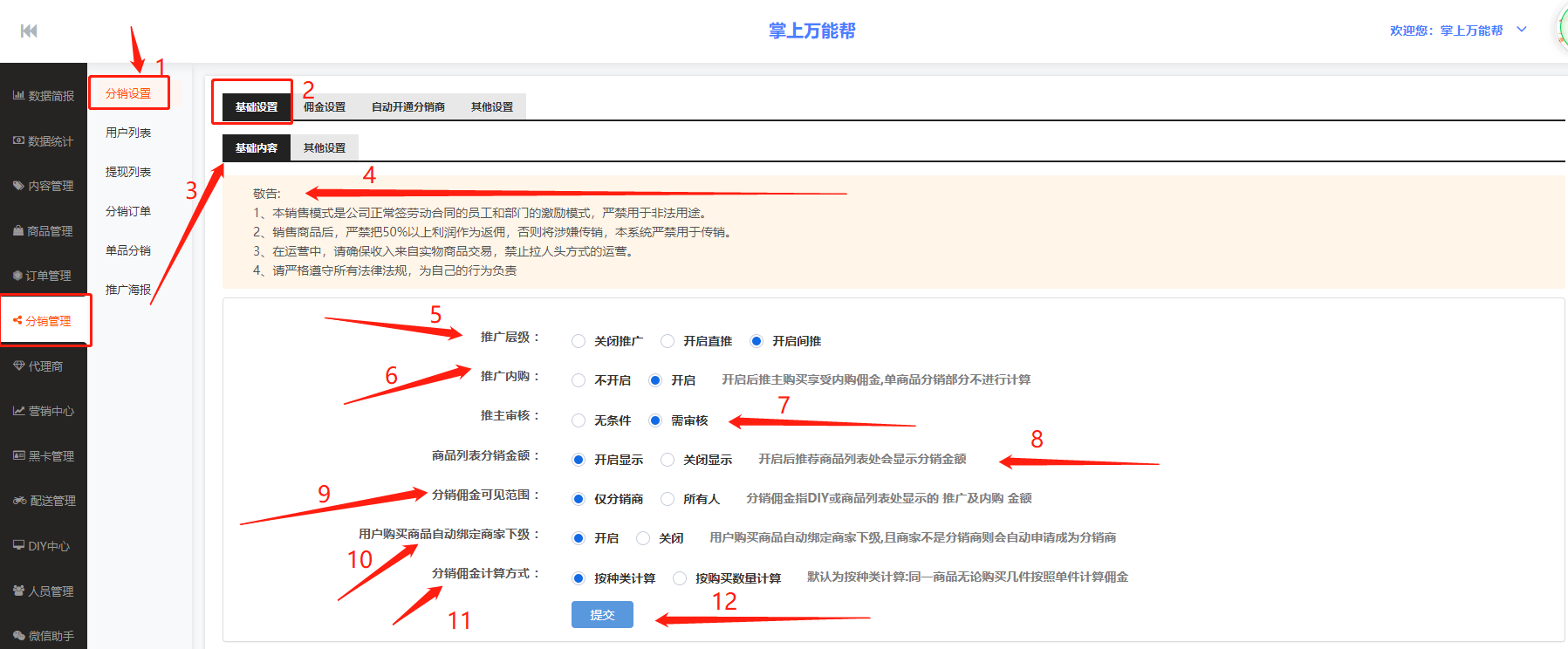 3、基础内容:分销管理分类中的分销设置里的基础设置里面的基础内容设置。