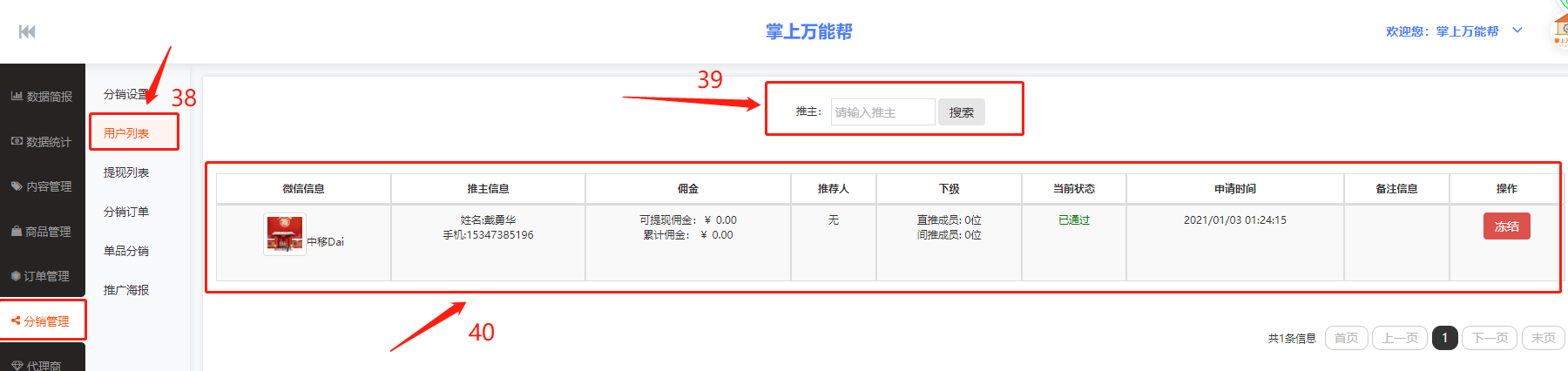 38、用户列表:分销管理分类中的用户列表的设置中心。