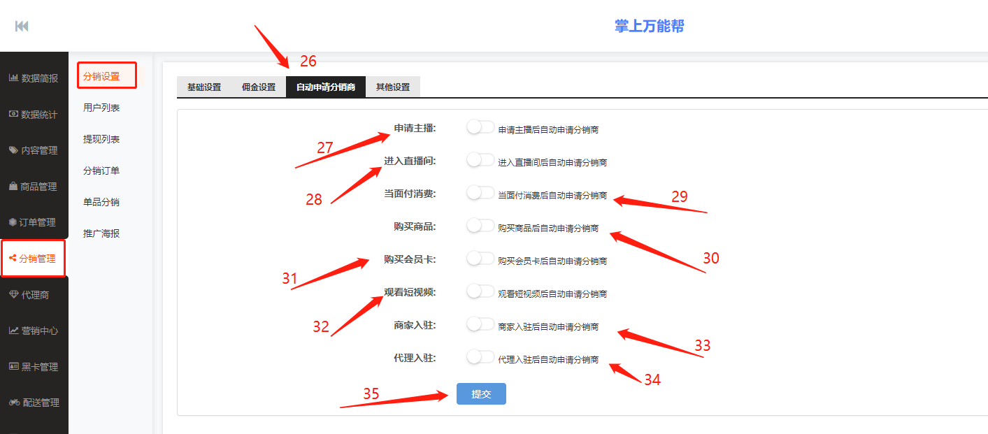 27、申请主播:在此设置是否开启申请主播设置选项(开启后申请主播后自动申请分销商)。