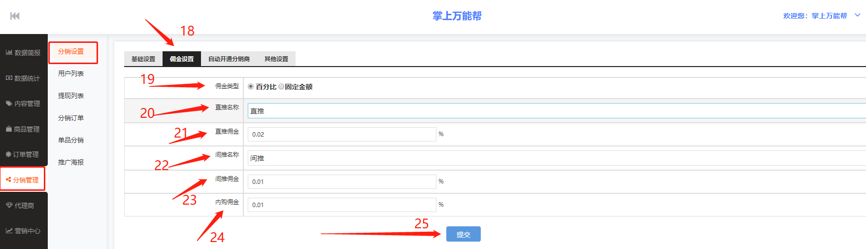 19、佣金比例:在此选择所需要设置的佣金比例设置选项。