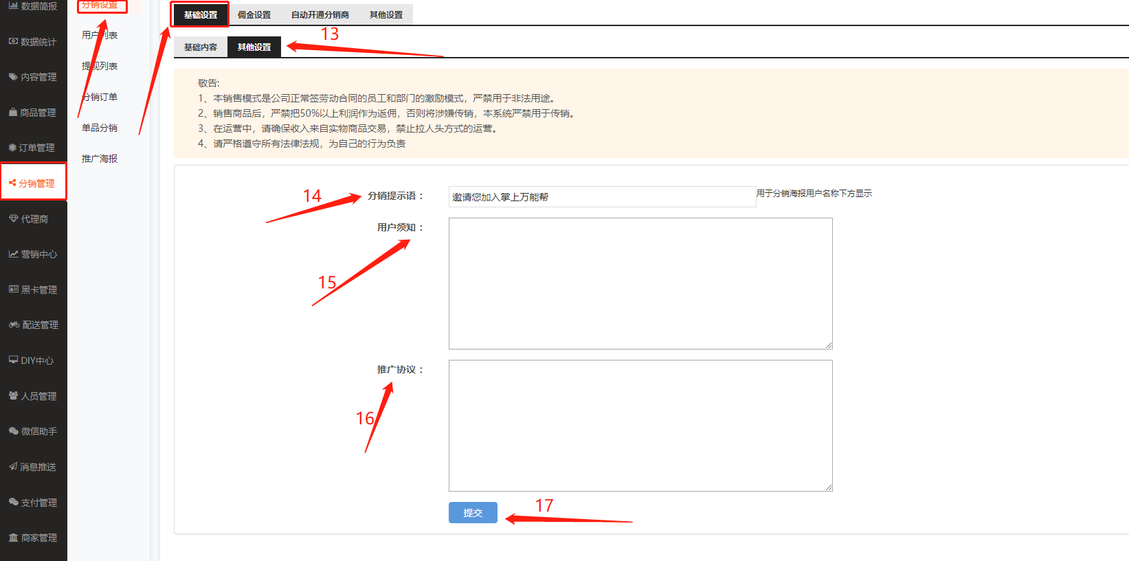 13、其他设置:分销管理分类中的分销设置里的基础设置里面的基础内容设置(其他设置)。