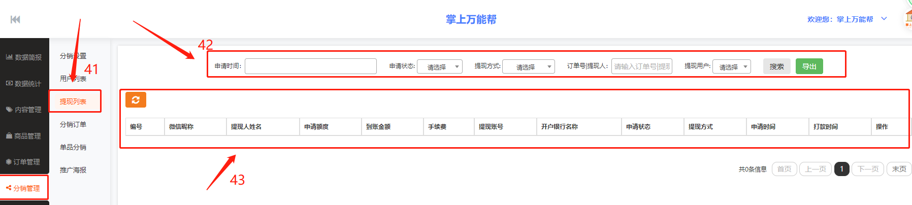 41、提现列表:分销管理分类中的提现列表的设置中心。