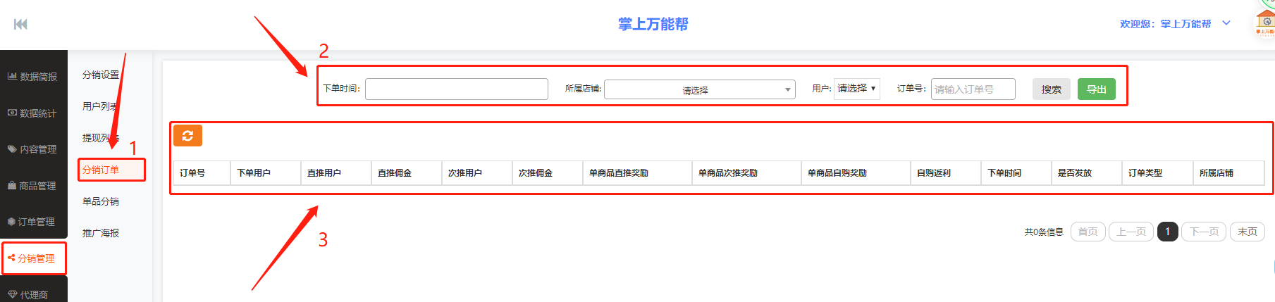 1、分销订单:分销管理分类中的分销订单的设置中心。