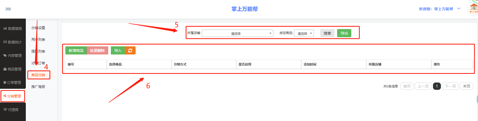 6、6框栏:6框栏中包括新增商品、批量删除、导入、编号、选择商品、分销方式、是否启用、添加时间、所属店铺、操作栏中结合表进行编辑查看数据。