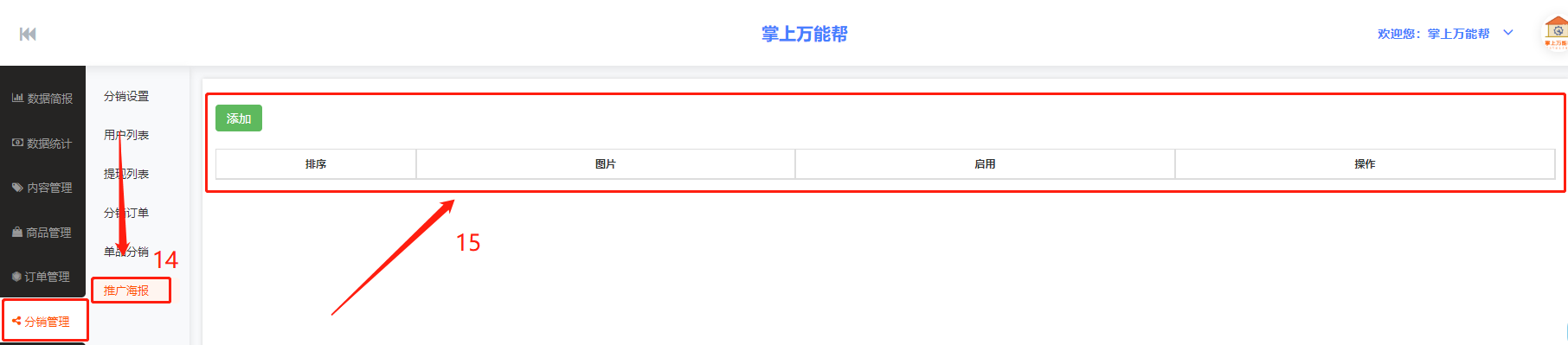 14、推广海报:分销管理分类中的推广海报的设置中心。