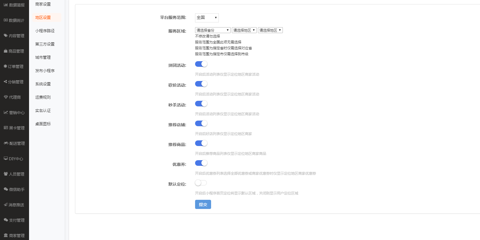 地区设置: 可以设置拼团活动,砍价活动,秒杀活动,推荐商品,推荐店铺。优惠劵,默认定位