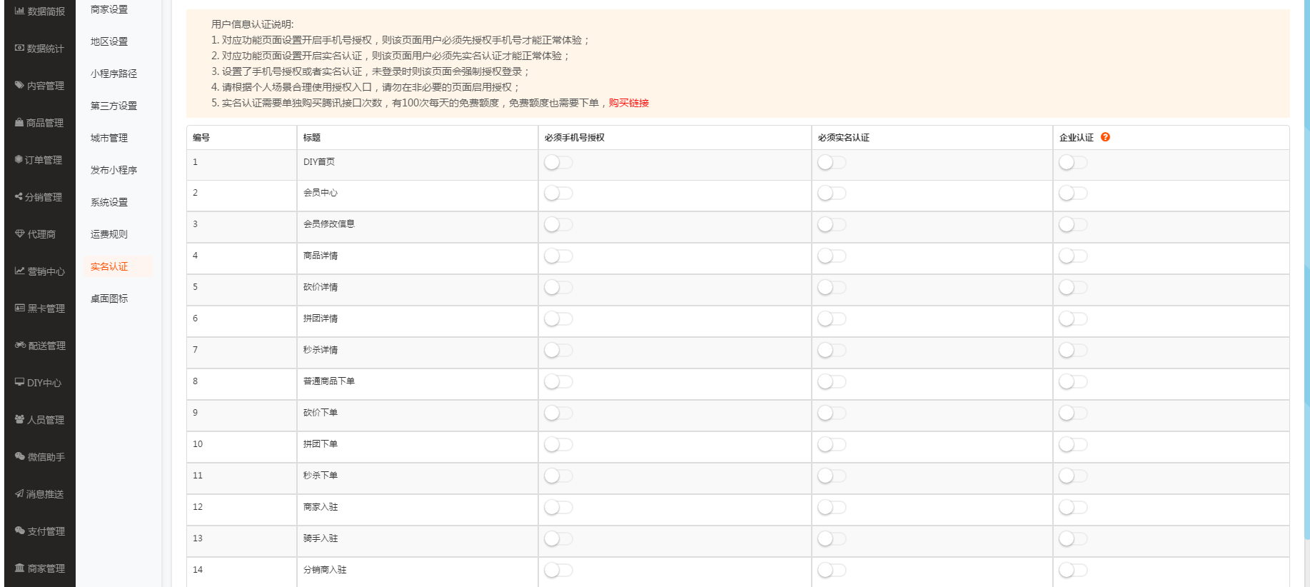 实名认证:这里可以设置很多东西,可以修改页面,可以设置会员中心,还可以弄拼团,砍价,秒杀等等,必须要手机号授权,必须实名认证