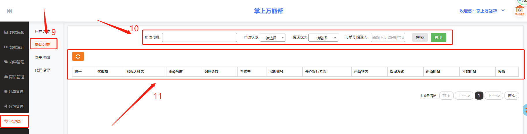 11、11框栏:11框栏栏中包括编号、代理商、提现人姓名、申请额度、到账金额、手续费、提现账号、开户银行卡名称、申请状态、提现方式、申请时间、打款时间、操作栏中结合表进行编辑查看数据。
