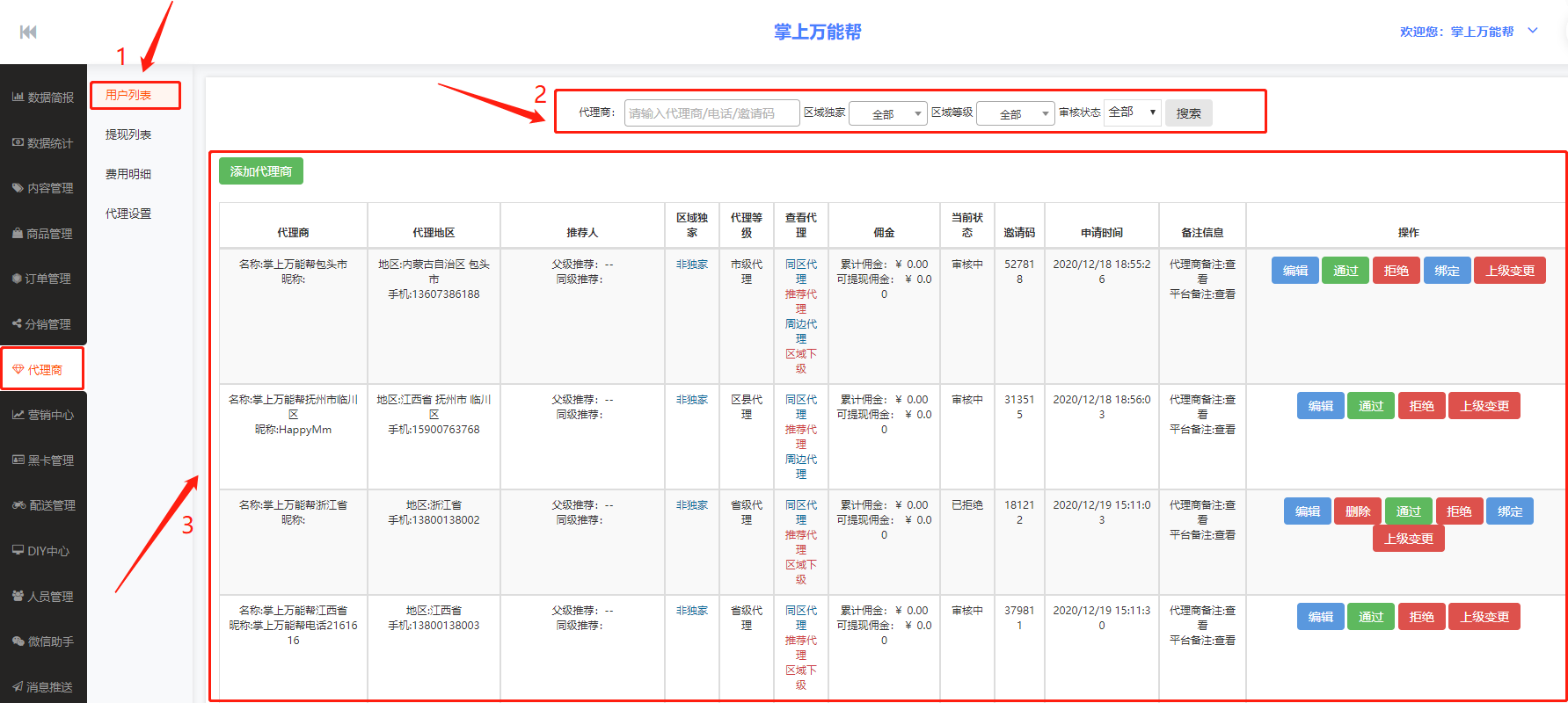 3、3框栏:3框栏中包括添加代理商、代理商、代理地区、推荐人、区域独家、代理等级、查看代理、佣金、当前状态、邀请码、申请时间、备注信息、操作时间可在项目栏中进行编辑查看数据。