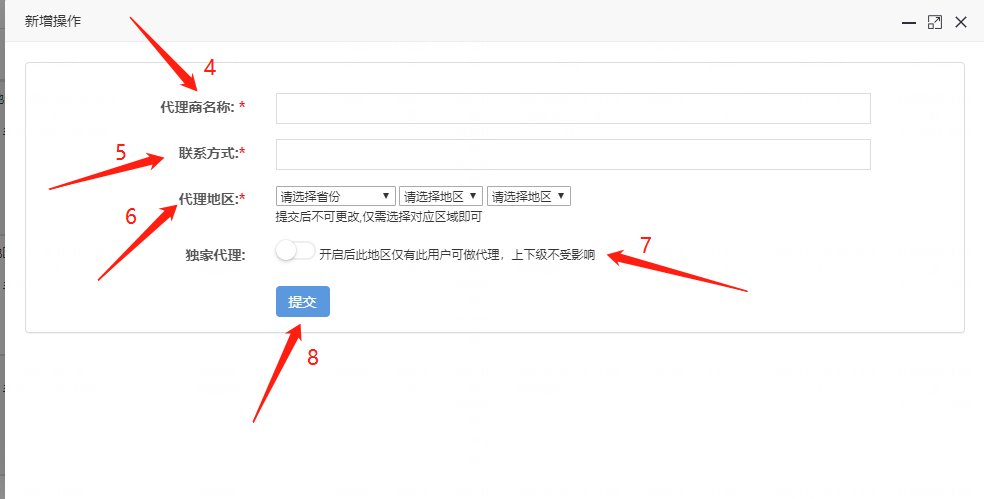 6、代理地区:在此选择所要选择的代理地区选项(提交后不可更改,仅需选择对应区域即可)。