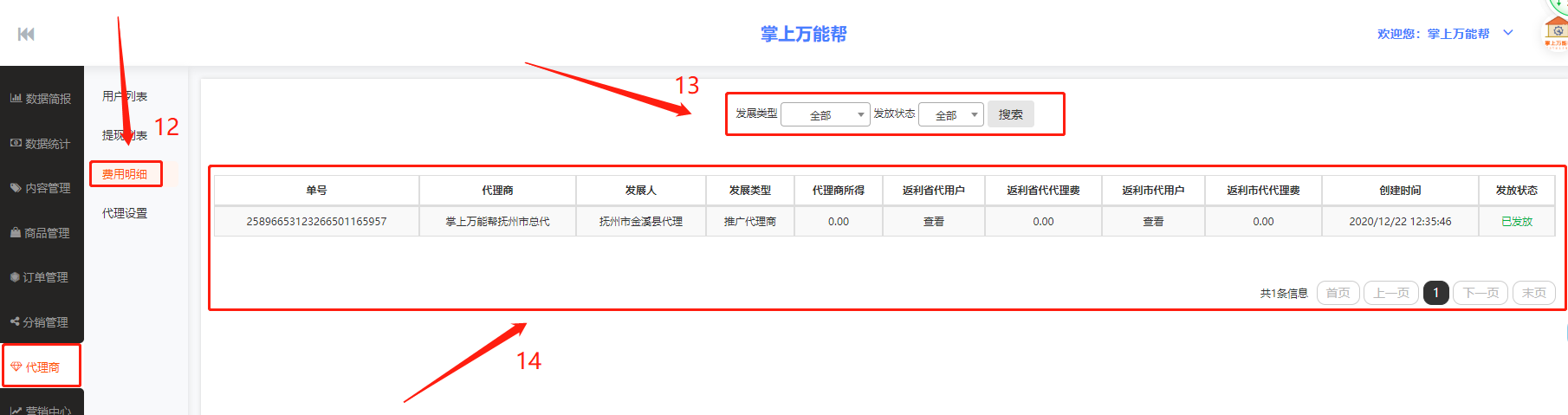 14、14框栏:14框栏中包括单号、代理商、发展人、发展类型、代理商所得、返利省代理用户、返利省代理费、返利市代用户、返利市市代理费、创建时间、发放状态、栏中结合表进行编辑查看数据。