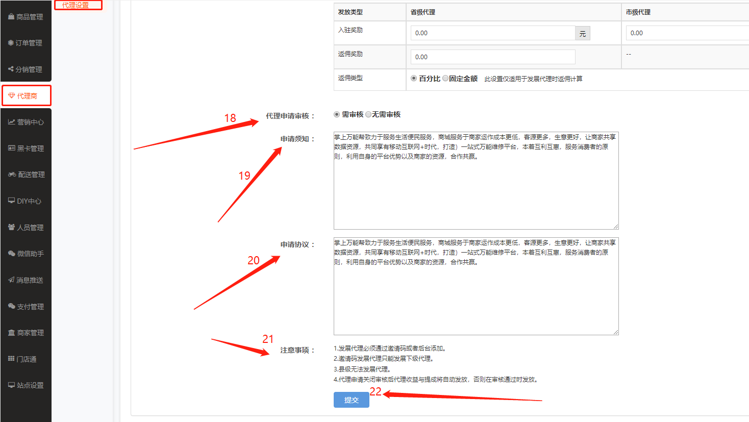 18、代理申请审核:在此设置是否需要开启代理申请审核设置选项。