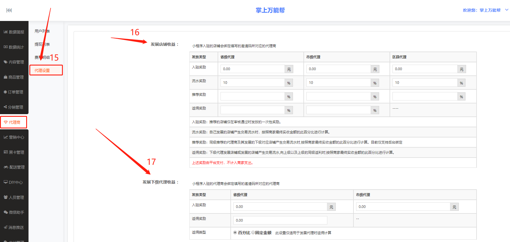 16、发展店铺收益:在此通过表格里内容设置发放类型、------(入驻奖励、流水奖励、推荐奖励、返佣奖励)省级代理、市级代理、区县代理、设置所需要设置的发展店铺收益内容(小程序入驻的店铺会绑定填写的邀请码所对应的代理商)。