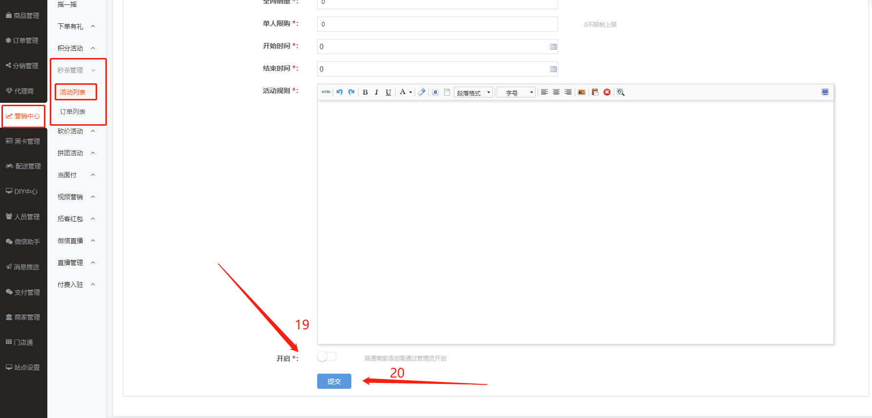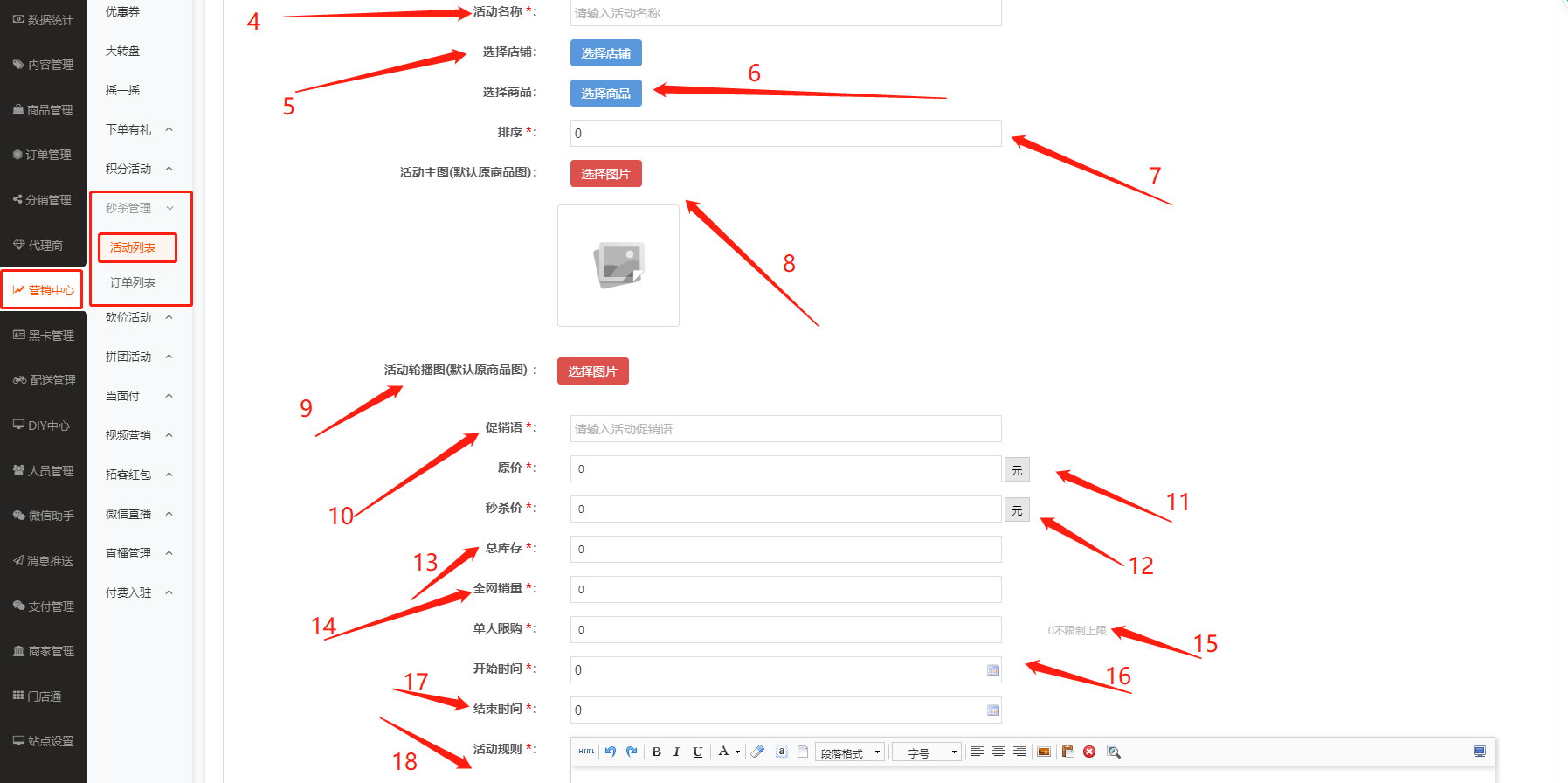 18、活动规则:在此输入所要新增活动商品的活动规则内容。