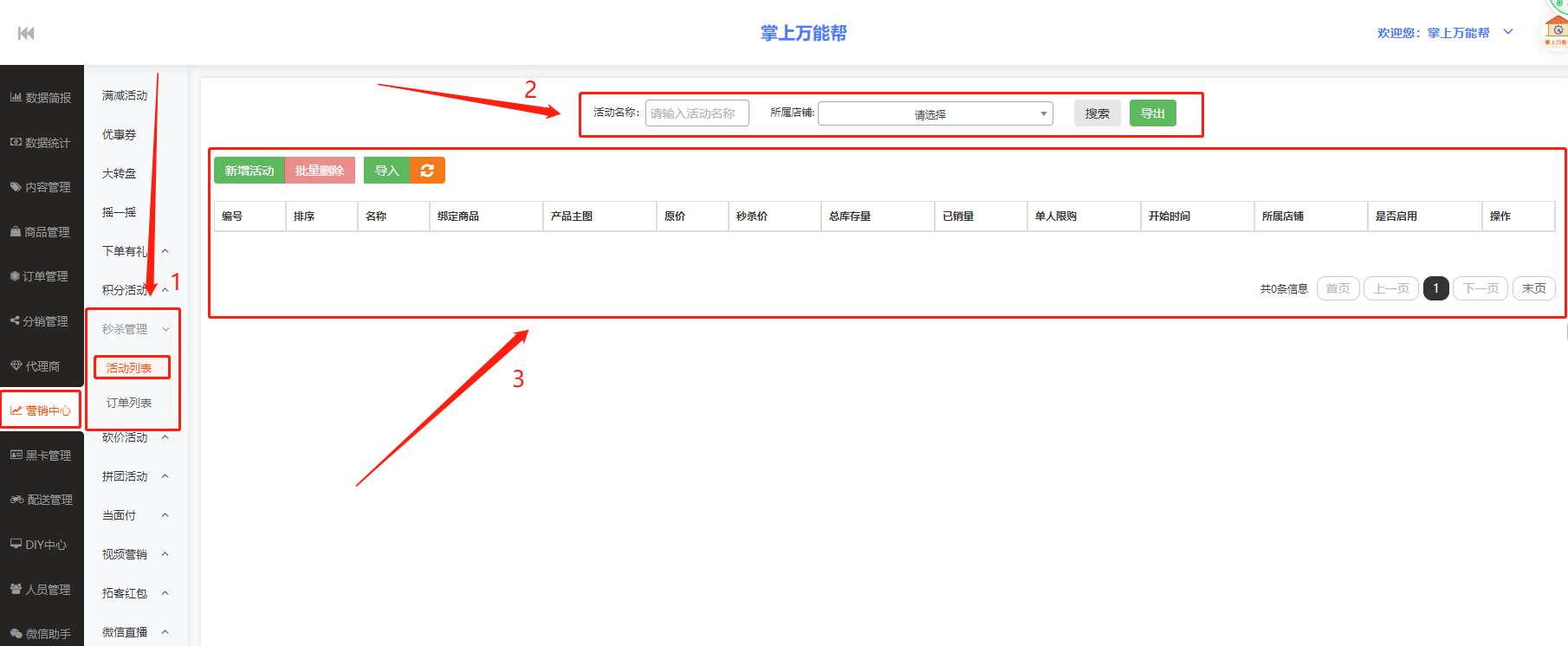 3、3框栏:3框栏中包括新增活动、批量删除、导入、编号、排序、名称、绑定商品、产品主图、原价、秒杀价、总库存量、已销量、单人限购、开始时间、所属店铺、是否启用、操作栏中结合表进行编辑查看数据。