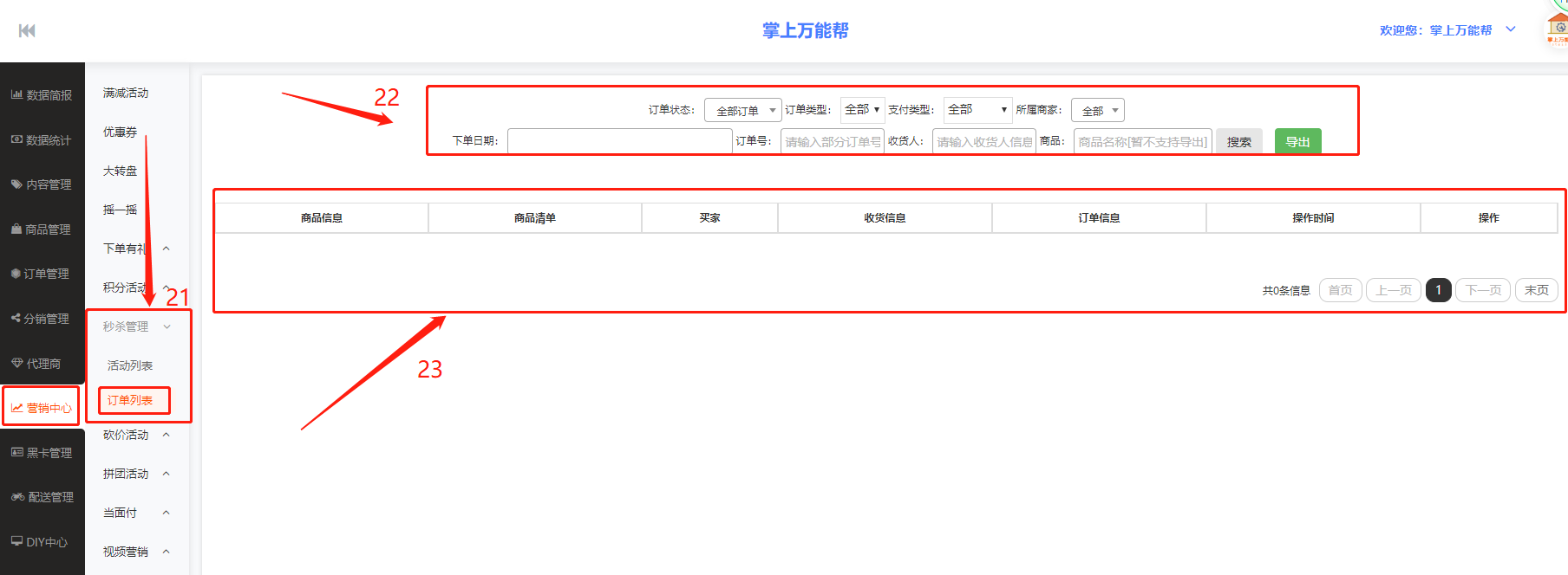 22、22框栏:22框栏中包括订单状态、订单类型、支付类型、所属商家、下单日期、订单号、收货人、商品、搜索、导出栏中结合表进行编辑查看数据。
