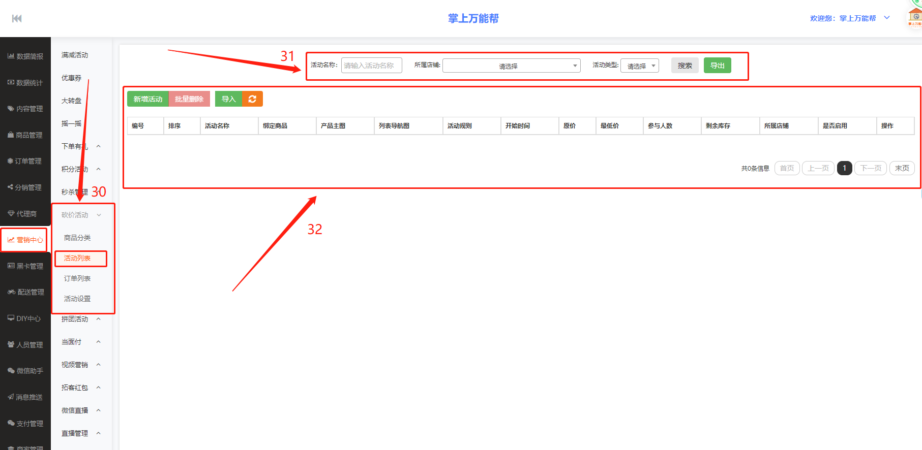 32、32框栏:32框栏中包括新增活动、批量删除、导入、编号、排序、活动名称、绑定商品、产品主图、列表导航图、活动规则、开始时间、原价、最低价、参与人数、剩余库存、所属店铺、是否启用、操作栏中结合表进行编辑查看数据。