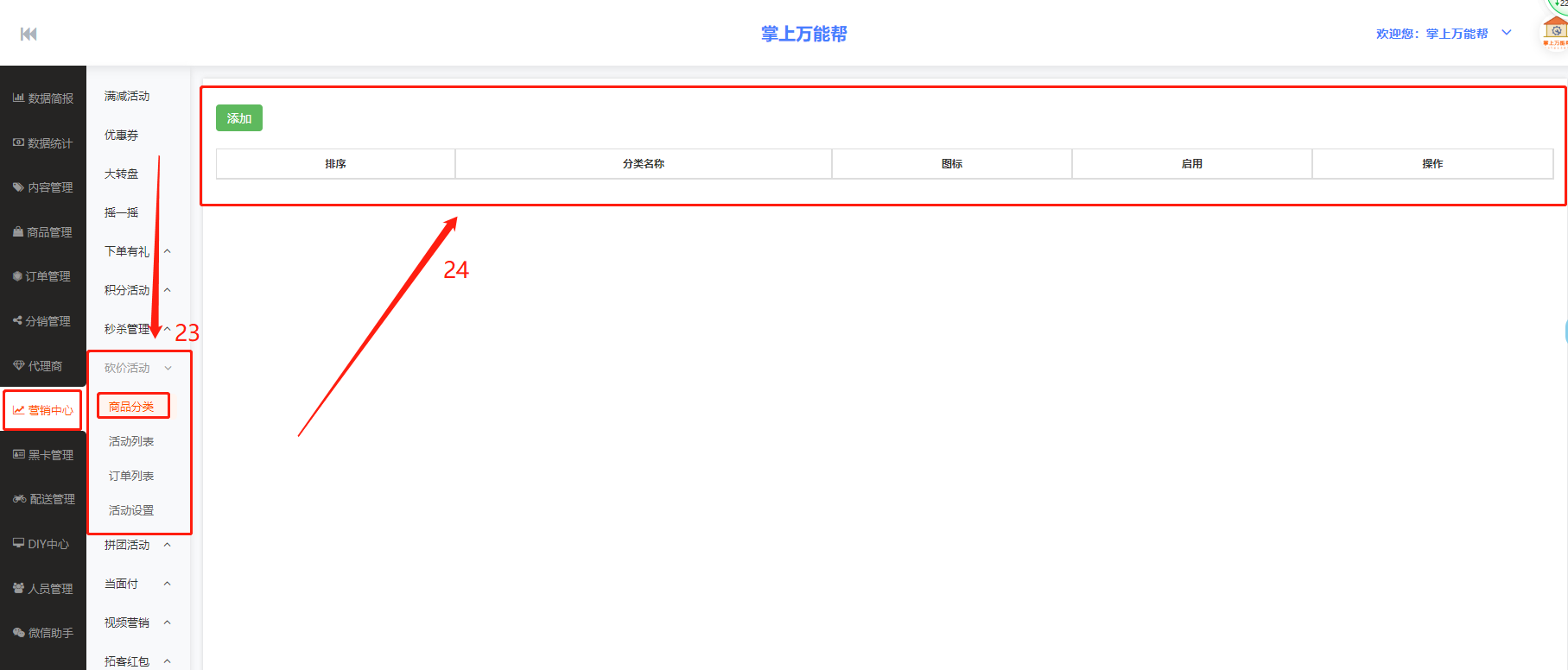 23、商品分类:砍价活动分类中的商品分类设置中心。