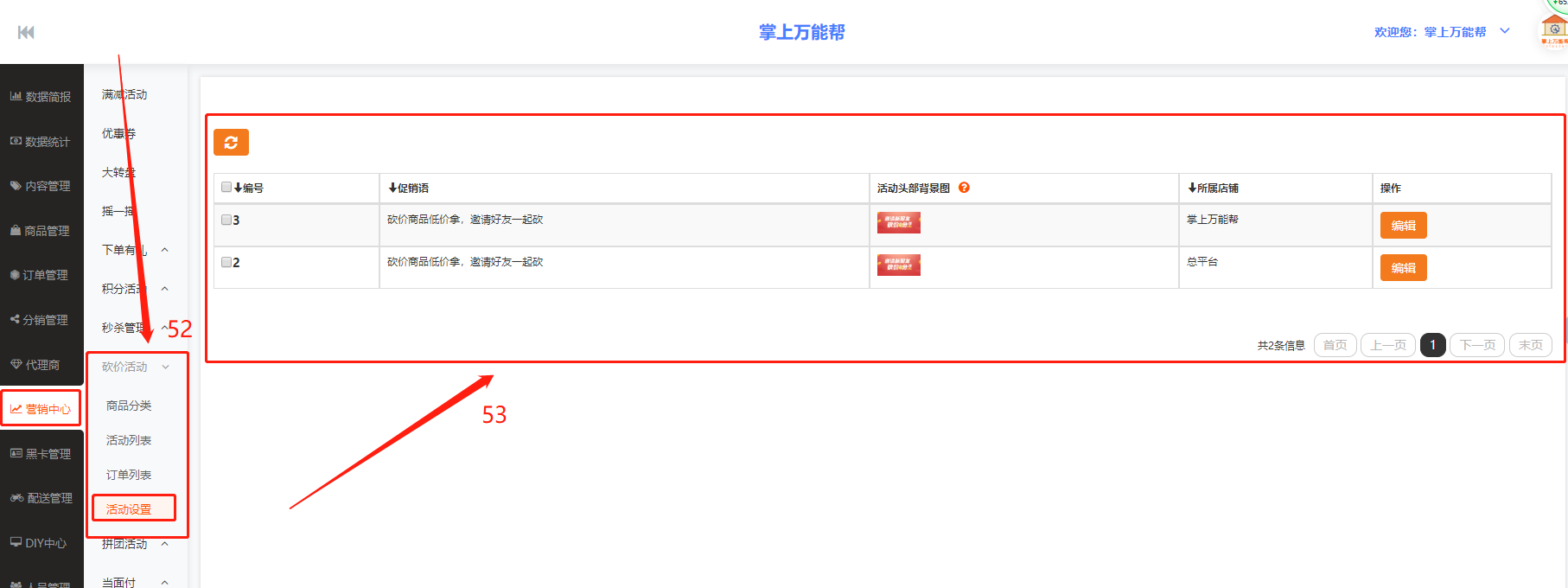 53、53框栏:53框栏中包括编号、促销语、活动头部背景图、所属店铺、操作栏中结合表进行编辑查看数据。