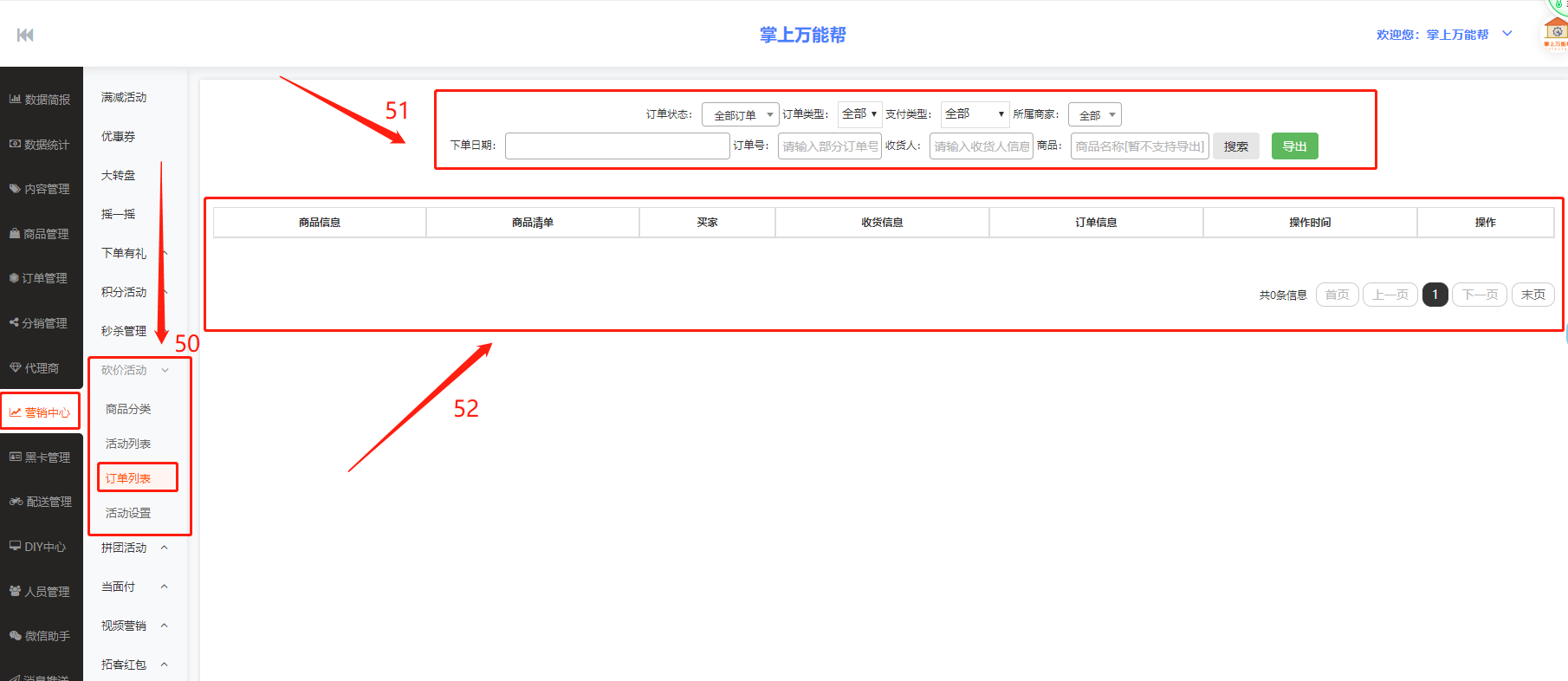 50、订单列表:砍价活动分类中的订单列表设置中心。