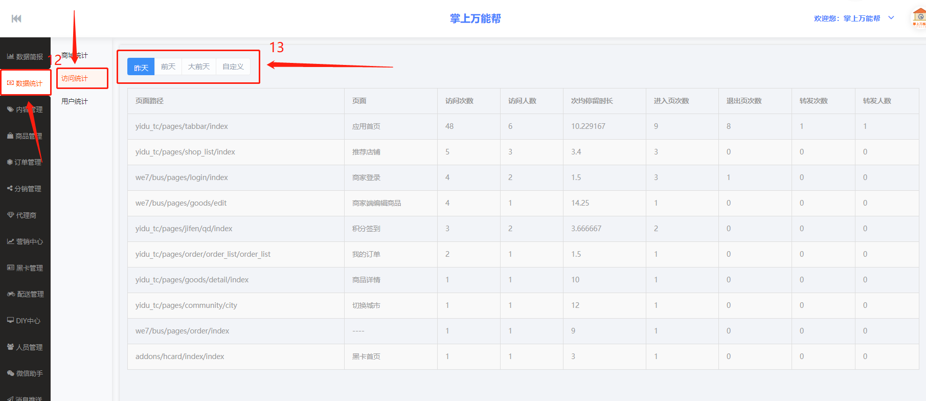 13、13栏框:13栏框中包括今天、昨天、大前天、自定义、可以点击栏目可以查看任何时候的访问系统数据。如:页面路径、页面、访问次数、访问人数、次均停留时长、进入页次数、退出页次数、转发次数、转发人数、等数据。