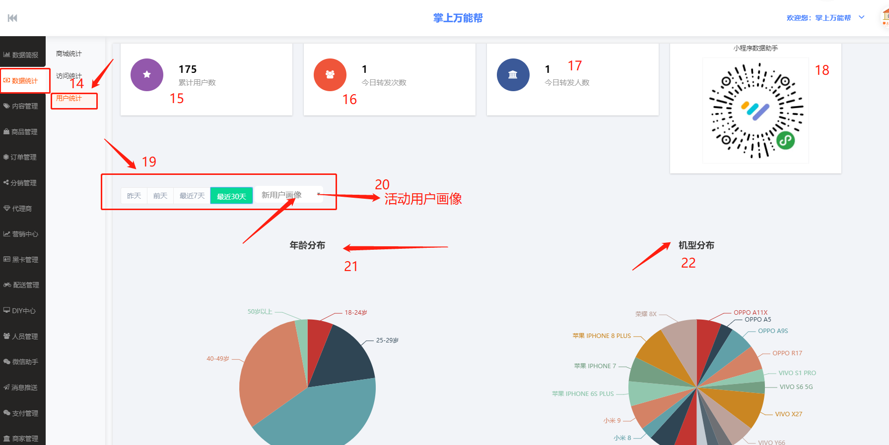 15、累积用户数:商家可进入平台在此可以观看到从开创平台以来所累积的用户数量。