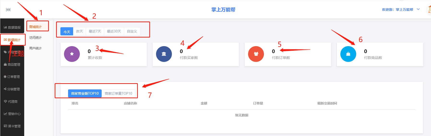 2、2框栏:2框栏中包括今天、昨天、最近7天、最近30天、自定义、可以点击栏目可以查看任何时候的商城系统数据。