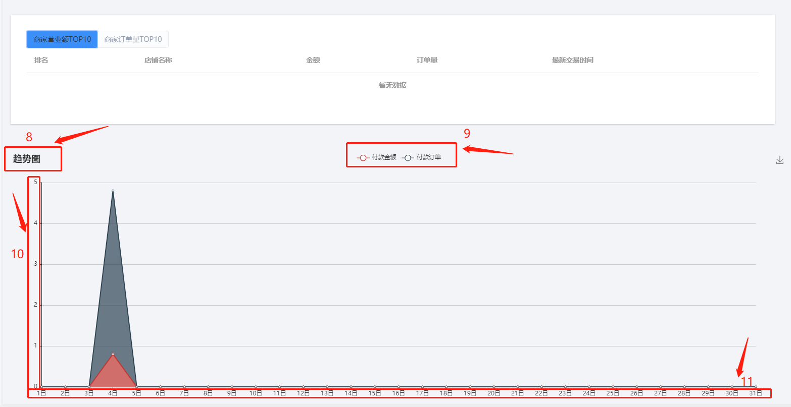 11、11框栏:11框栏中表示付款订单、付款金额所在趋势图中的时间日期情况。