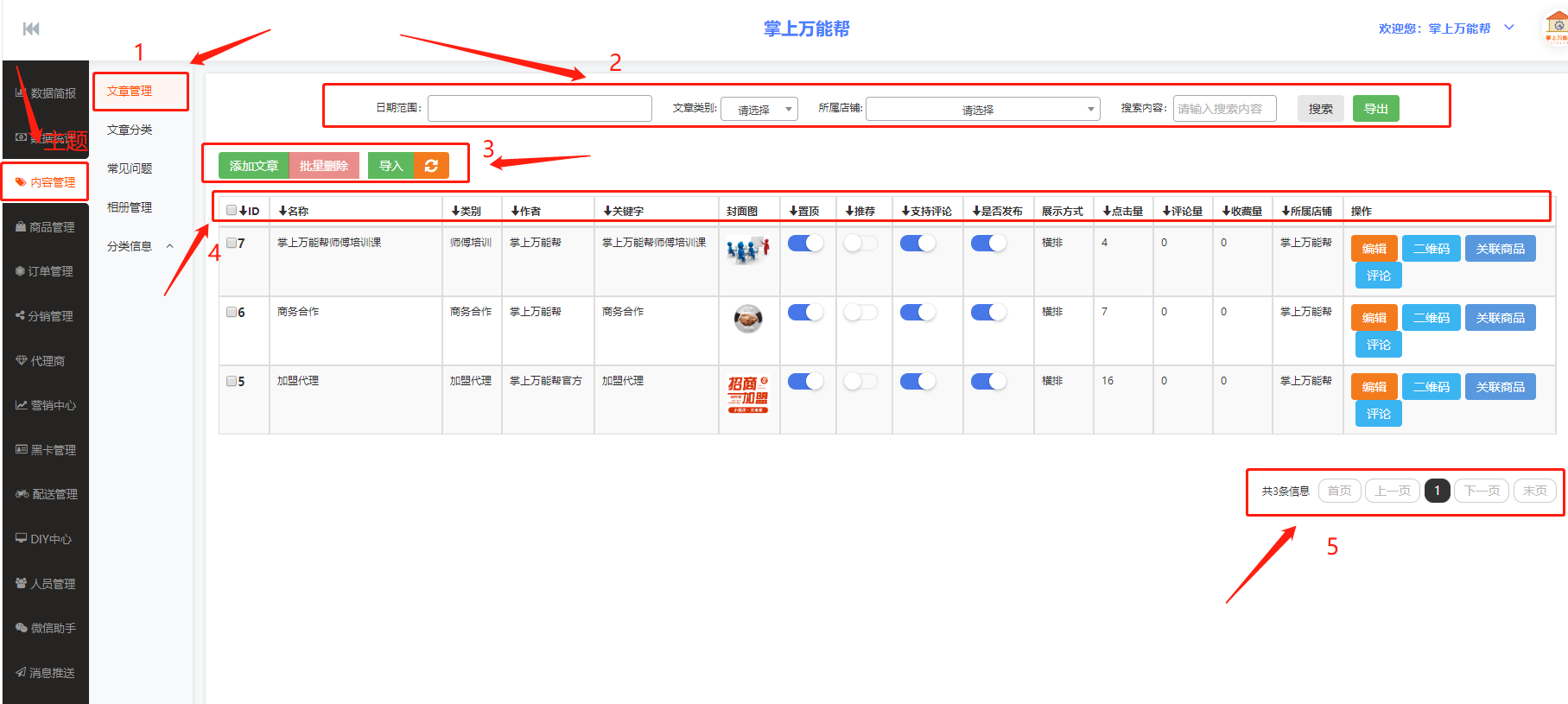 2、2框栏:2框栏中包括日期范围、文章类别、所属店铺、搜索内容、搜索、导出、项目栏。可在项目栏中进行编辑查看数据。