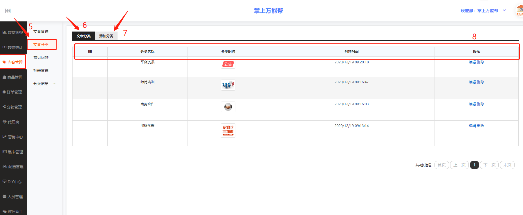 8、8框栏:8框栏包括分类名称、分类图标、创建时间、操作。结合6对应查看内容。