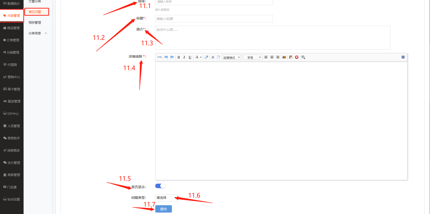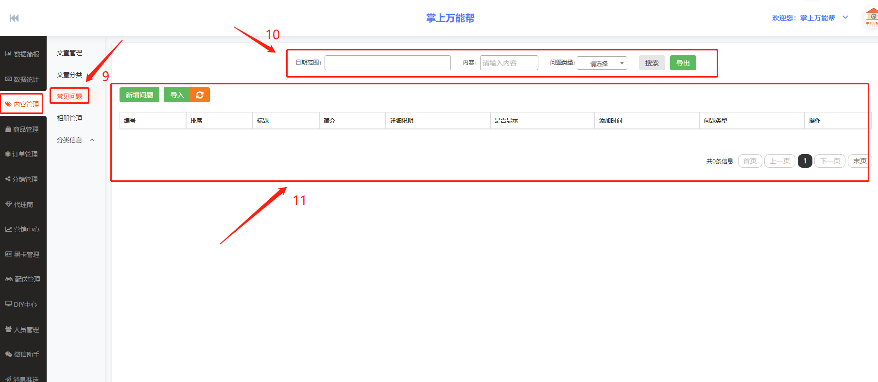 11、11框栏:11框栏中包括新增问题、导入、编号、排序、标题、简介、详细说明、是否显示、添加时间、问题类型、操作,可在项目栏中进行编辑和查看数据.
