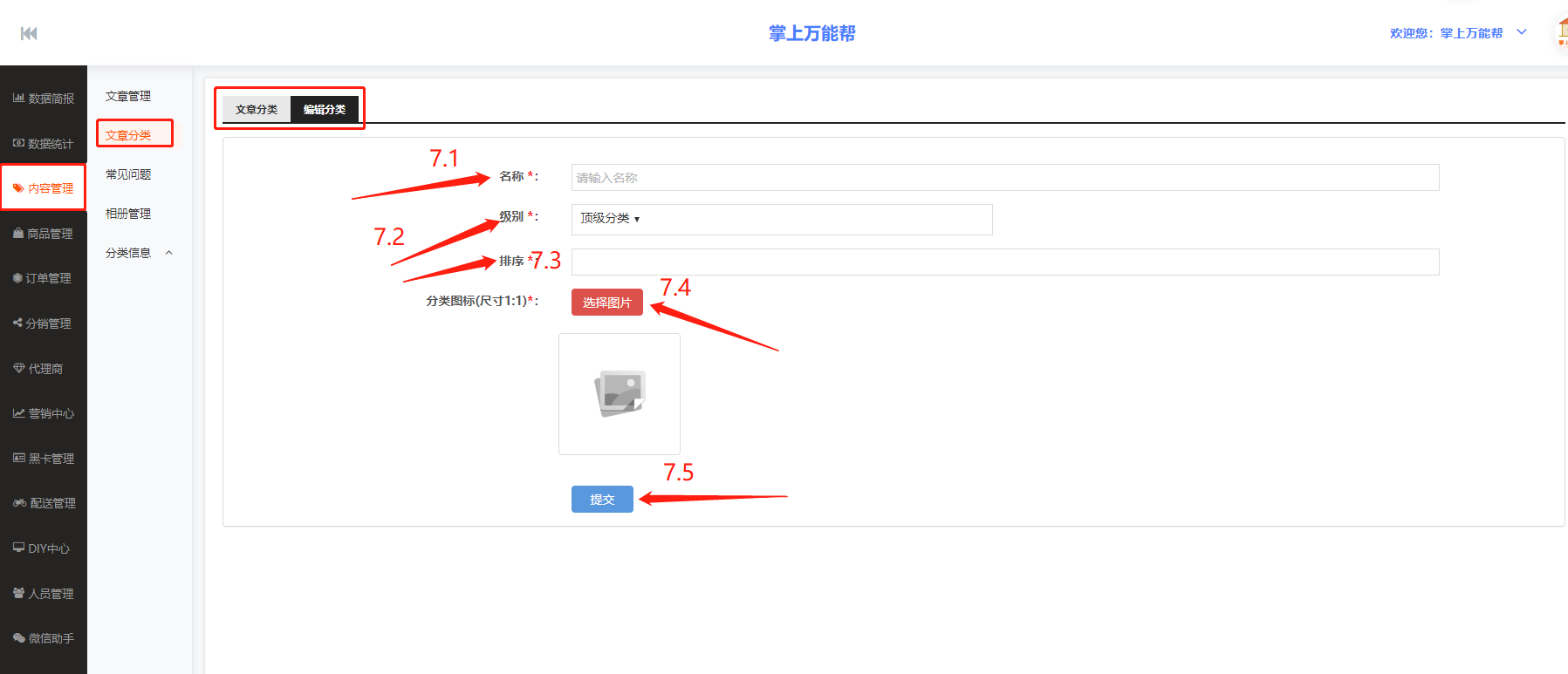 7、添加分类:文章添加分类栏点击添加分类跳转进入添加分类编辑中心页面。